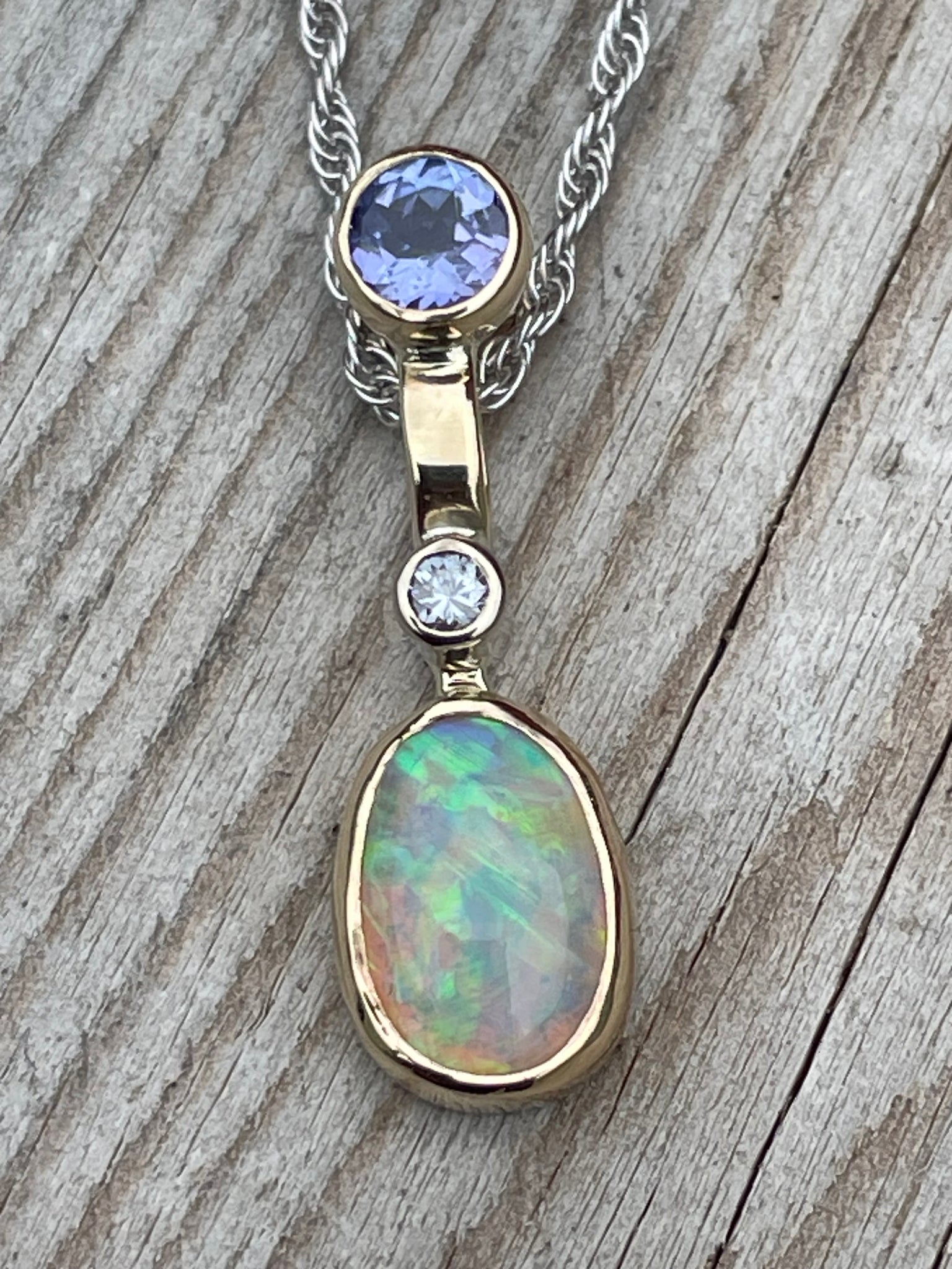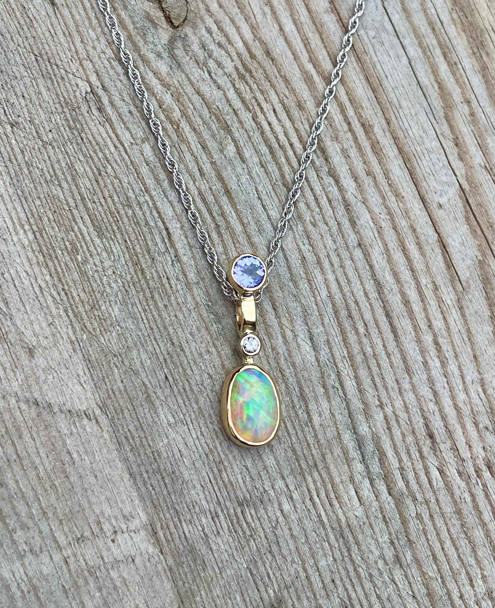 The vibrant colours and sparkle of diamond draw you in and the opulence of 14k yellow gold mount and optional 10k white gold chain, complete the piece.